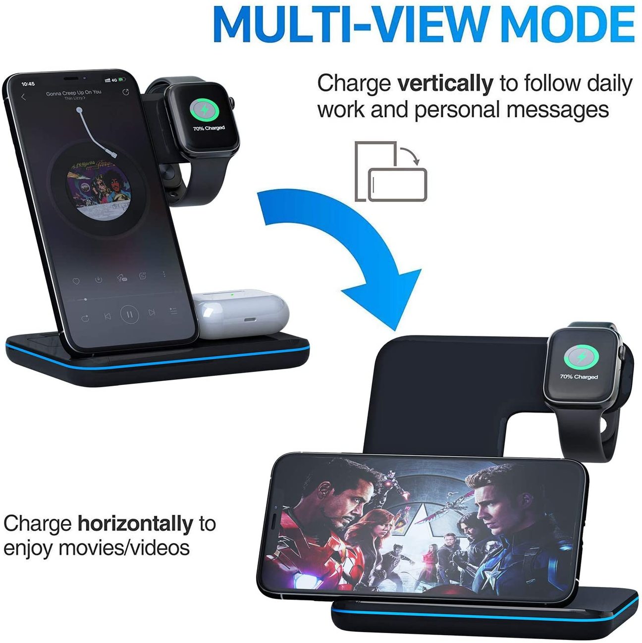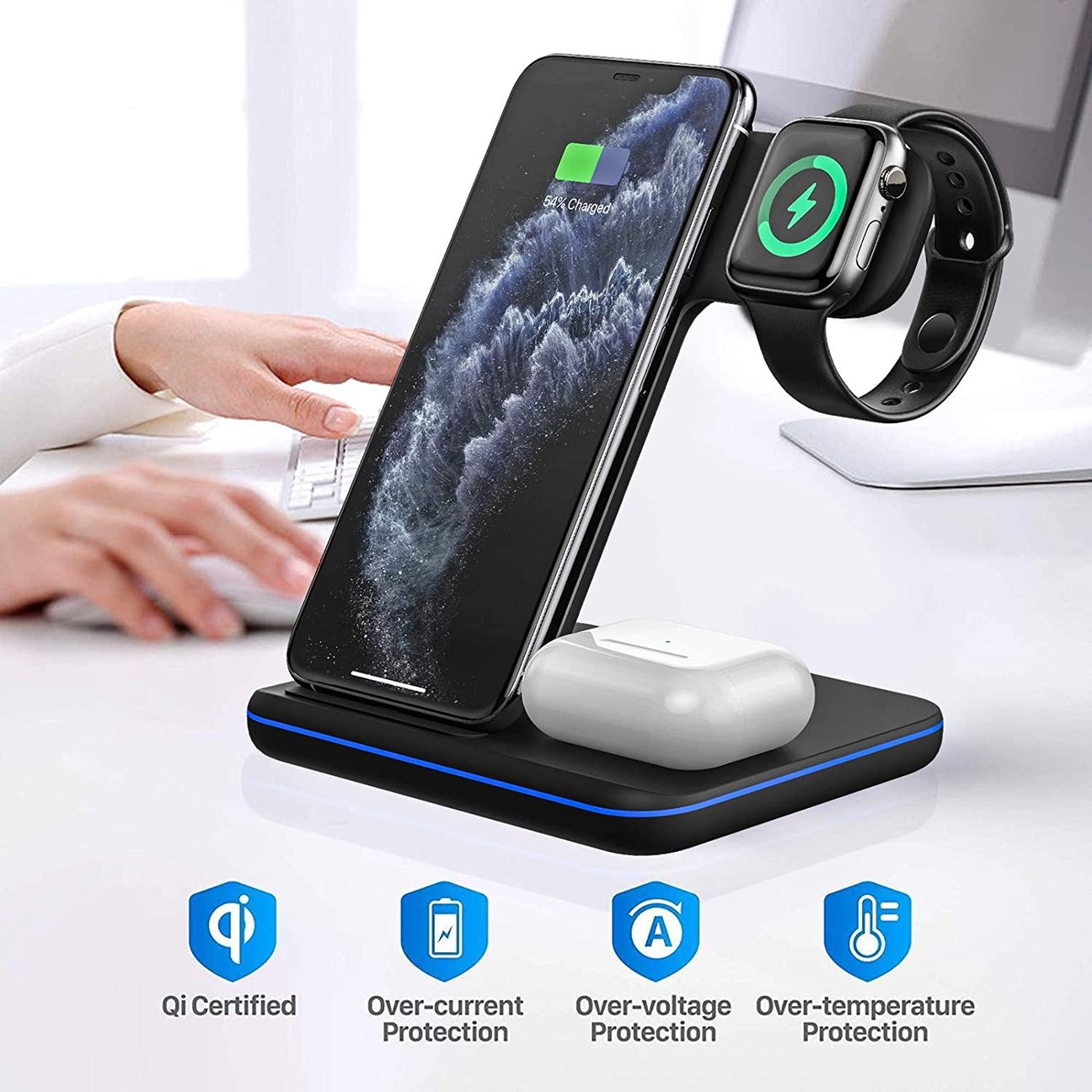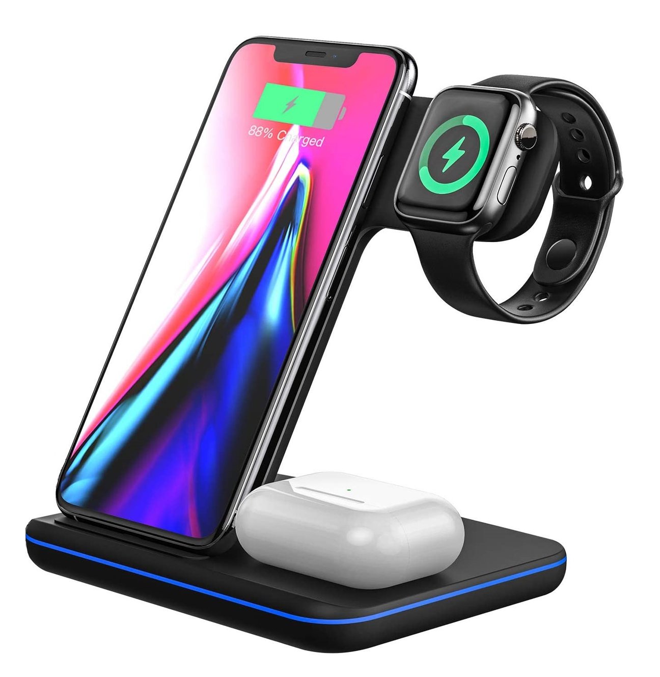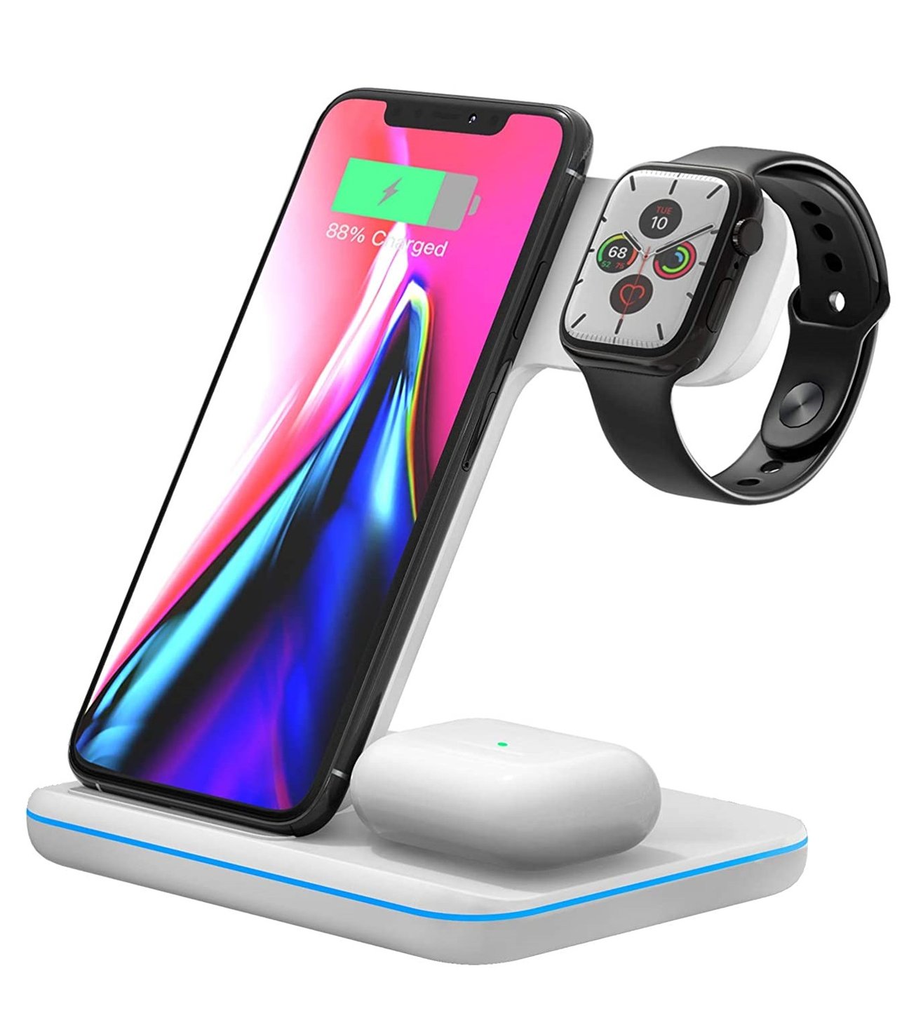 Dieses kabellose 3-in-1-Ladegerät wurde entwickelt, um alle Ihre Lieblingsgeräte von Apple an einem zentralen Ort aufzuladen. Legen Sie einfach Ihr iPhone, Ihre AirPods und Ihre Apple Watch auf das Ladegerät und Ihre Geräte werden geladen. Schneller als jedes andere kabellose Ladegerät, das je hergestellt wurde.